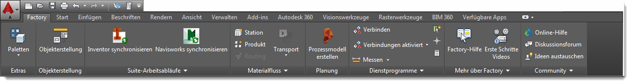 Die Benutzeroberfläche für Factory Design Utilities befindet sich auf der Registerkarte Factory. Sie enthält Gruppen mit den Namen Extras, Objekterstellung, Suite-Arbeitsabläufe, Materialfluss, Planung, Dienstprogramme, Factory-Konzept und Community. Eine Kombination aus Factory- und Standard-AutoCAD-Gruppen ergibt die Vorgabe-Arbeitsumgebung von Factory.