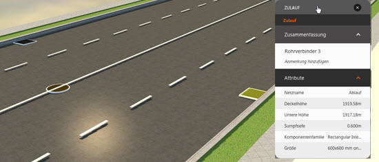 Die Fahrbahn-Entwässerungsobjekte liegen unter der Straßenoberfläche. Am einfachsten können Sie sie anzeigen, indem Sie unterhalb der Straßenoberfläche navigieren. Stattdessen können Sie auch eine nicht transparente durch eine transparente Straßenoberfläche ersetzen. Weitere Informationen erhalten Sie unter So können Sie Fahrbahn-Entwässerungsobjekte unter der Straße anzeigen.