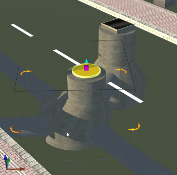 Klicken Sie auf die Fahrbahn-Entwässerungsobjekte, um die zugehörige Objektkarte und Transformations-Gizmos anzuzeigen.