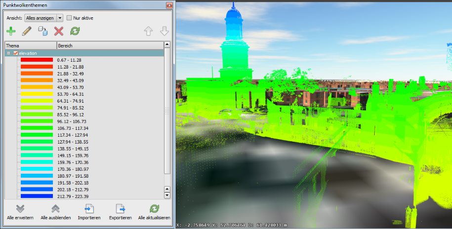 Höhe | Themen nach Höhe. Minimale und maximale Werte werden automatisch anhand der Punktwolkendaten festgelegt. Sie können sie bei Bedarf anpassen. |