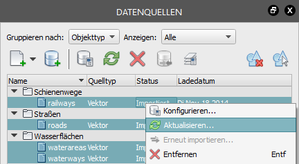 - Aktualisieren Sie die ausgewählten Datenquellen über das Kontextmenü oder durch Klicken auf