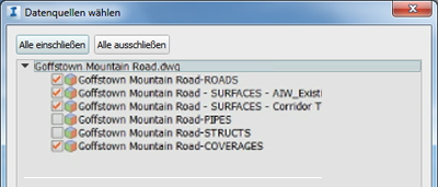Durch die Einstellungen im vorhergehenden Beispiel werden derzeit alle verfügbaren Typen als Quelle angegeben; die Ausnahme bilden Entwässerungsobjekte (Rohrleitungen und Tragwerke).