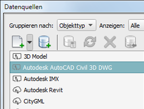 Anmerkung: Für das Hinzufügen von Civil 3D-Daten zu einem Modell mithilfe einer DWG-Datei muss AutoCAD Civil 3D lokal auf Ihrem Computer oder Netzwerk installiert sein. Stattdessen können Sie auch Daten hinzufügen, die eine aus einer DWG-Datei erstellte IMX-Datei als Quelle angeben. Weitere Informationen erhalten Sie unter
