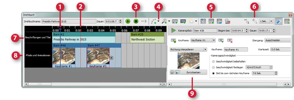- Die Steuerelemente für die Wiedergabe geben das gesamte Drehbuch wieder, beginnend von der Wiedergabeanzeige (blaue Linie). Einzelne Elemente verfügen über eigene Steuerelemente für die Wiedergabe.