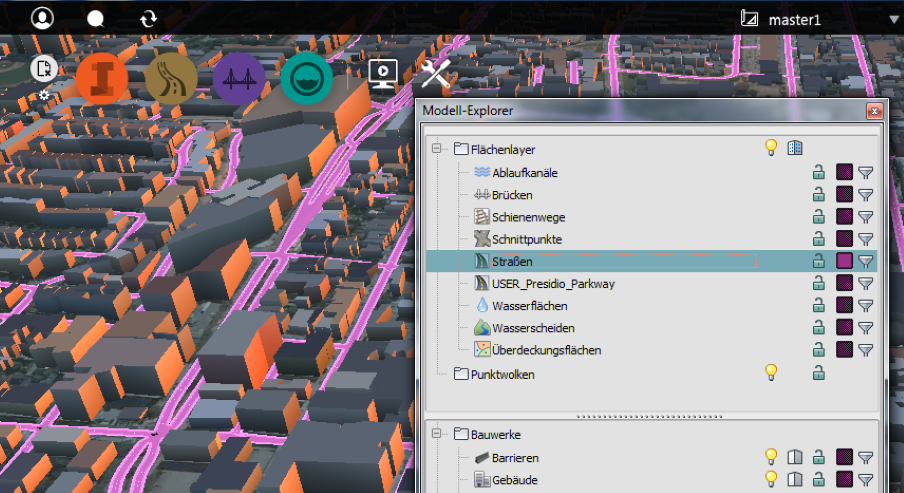 Vorgabemäßig wird das Symbol für Hervorhebung aktivieren hell-lila, wenn die Option aktiviert ist. Und Mitglieder dieser Objektklasse oder dieses Teilsatzes werden im Modell in dieser Farbe hervorgehoben.