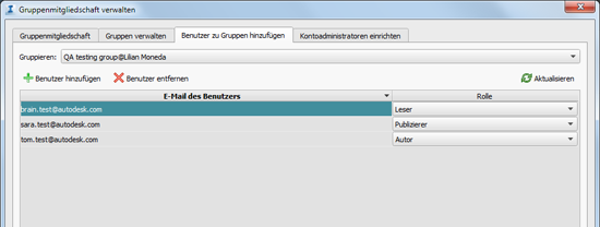 Administratoren verwenden die Registerkarte Benutzer zu Gruppen hinzufügen in der Gruppe Gruppenmitgliedschaft verwalten, um Mitglieder zu einer Entwurfsgruppe hinzuzufügen und ihnen Rollen zuzuweisen.