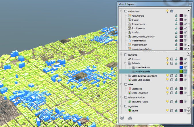Um beispielsweise Gebäude mit unterschiedlichen Höhen visuell zu vergleichen, erstellen Sie einen untergeordneten Satz für jede Höhe und weisen jedem eine andere Farbe zur Hervorhebung zu. Aktivieren und deaktivieren Sie dann die Hervorhebung für die unterschiedlichen untergeordneten Sätze, um ihre Anzahl, Position usw. zu vergleichen.
