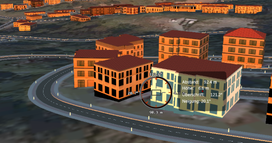Eine Beschriftung gibt die Erhebung, die Ausrichtung und den Winkel der Neigung zum Ziel an. Sie können weitere Messungen von Abständen zwischen dem Blickpunkt und anderen Zielen vornehmen, indem Sie auf mehrere Endpunkte klicken. Jede Messung wird separat beschriftet.