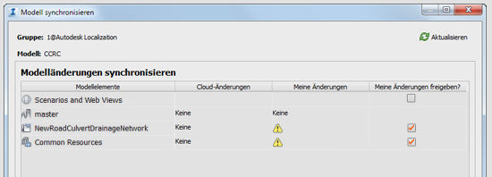 - Überprüfen Sie die Informationen unter Cloud-Änderungen, Meine Änderungen und Meine Änderungen freigeben für jeden Modellelementtyp. Aktivieren bzw. deaktivieren Sie die Kontrollkästchen für Meine Änderungen freigeben für Elemente, die Sie in dieser Synchronisierung nicht aktualisieren möchten.