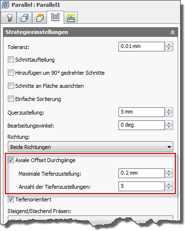Axiale Offset-Durchgänge funktionieren ähnlich wie mehrfache Schichtzustellungen bei 2D-Operationen und eignen sich dazu, einen festen Betrag des Rohteils mittels mehrerer Durchgänge abzutragen. Wenn Sie beispielsweise ein Aufmaß von 1 mm haben, können Sie dieses in fünf Durchgängen von je 0,2 mm mit parallelem Schlichten abtragen.