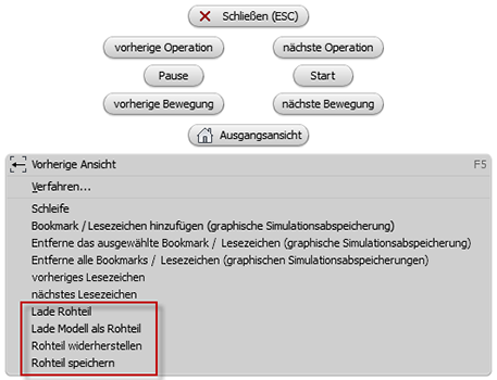 Zusätzliche Überlaufoptionen des Minimenüs werden aktiviert und verfügbar, wenn Sie während der Simulation den Rohteilmodus mit Multi-Achsen auswählen.