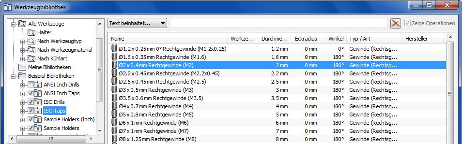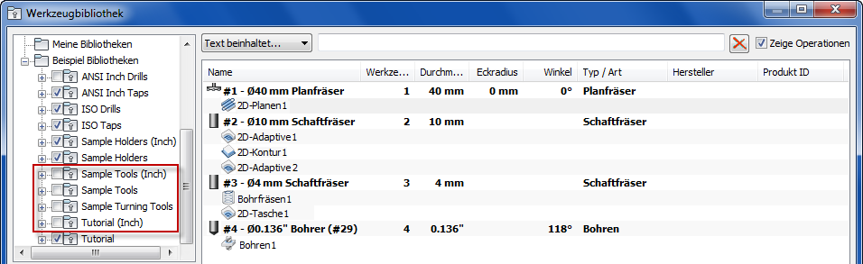 Durch Auswählen des Suchordners Alle Werkzeuge ganz oben in der Baumstruktur Werkzeugauswahl werden alle Ihre Werkzeuge aus allen Bibliotheken in der Werkzeugliste auf der rechten Seite angezeigt. Wenn Sie einen der Suchordner unter Alle Werkzeuge auswählen, wird die Liste augenblicklich aktualisiert und zeigt nur noch die Werkzeuge an, die dem ausgewählten Suchordner entsprechen.