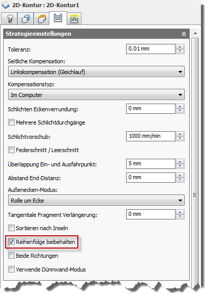 Um die Sortierung manuell zu steuern, wählen Sie die einzelnen Konturen in der Reihenfolge, in der sie bearbeitet werden sollen, und aktivieren das Kontrollkästchen Reihenfolge beibehalten auf der Registerkarte Strategieeinstellungen.