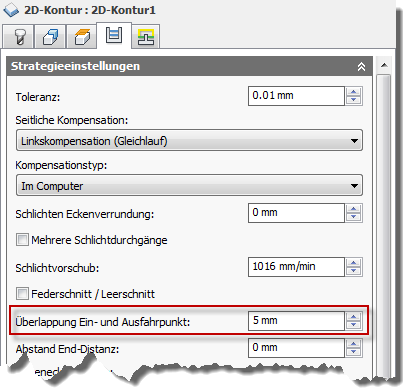 In einigen Fällen zeigt sich bei 2D-Kontur-Werkzeugwegen eine sichtbare Markierung aufgrund von Werkzeugdurchbiegung am Einstiegspunkt, da das Werkzeug normalerweise am selben Punkt in die Kontur eintritt und diese wieder verlässt. Um dieses Problem zu vermeiden, können Sie die Einstellung Überlappung Ein- und Ausfahrpunkt auf der Registerkarte Strategieeinstellungen verwenden.