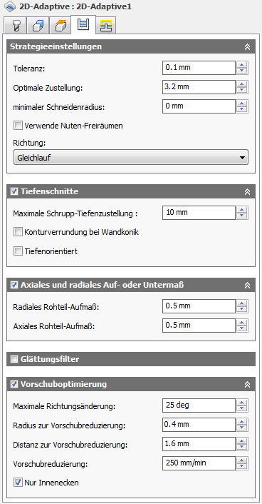 Die Glättung funktioniert am besten, wenn die Toleranz (die Genauigkeit, mit der der ursprüngliche, linearisierte Werkzeugweg generiert wird) größer oder gleich der Glättungstoleranz (Linien-/Bogenanpassung) ist.