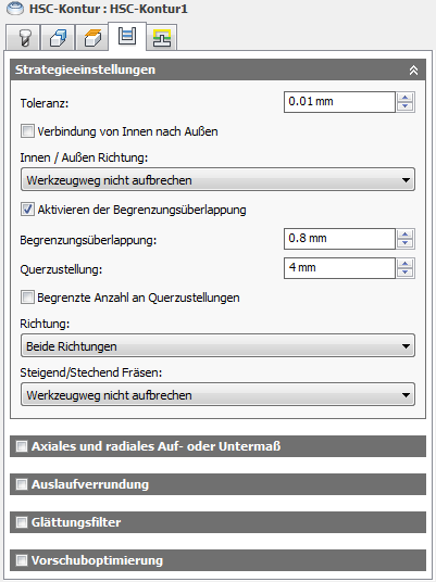 Glättet den Werkzeugweg, indem überschüssige Punkte entfernt und Bogen innerhalb der definierten Filtertoleranz angepasst werden.
