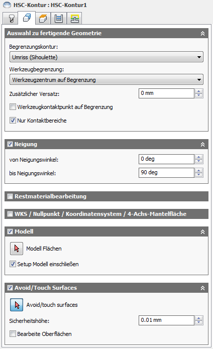 Es werden nur Bereiche bearbeitet, die größer oder gleich den Werten der Parameter Von Neigungswinkel und Bis Neigungswinkel sind.