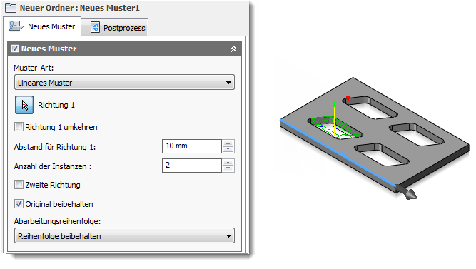 - Beginnen Sie, indem Sie eine oder mehrere Operationen, die nach einem Muster verlaufen sollen, für ein einzelnes Element oder das Bauteil erstellen.