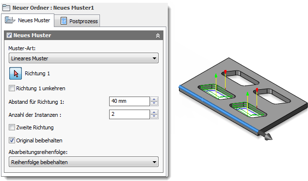 - Wählen Sie schließlich im Dropdown-Menü Abarbeitungsreihenfolge aus, ob die Operationen im Muster anhand von Werkzeug oder Operation neu sortiert werden sollen oder ob die Operationsreihenfolge im Muster beibehalten werden soll.