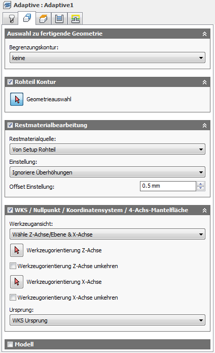 Diese vorgabemäßig aktivierte Option sorgt dafür, dass das im Setup ausgewählte Modell zusätzlich zu den in der Operation ausgewählten Modellflächen einbezogen wird. Wenn Sie dieses Kontrollkästchen deaktivieren, wird der Werkzeugweg nur für die in der Operation ausgewählten Flächen erzeugt.