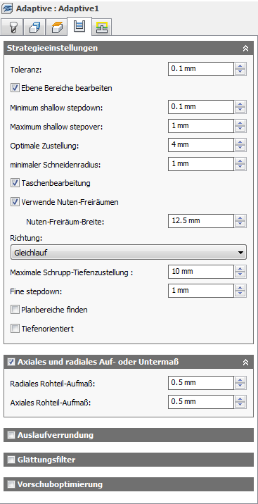 Sowohl das radiale als auch das axiale Aufmaß kann einen negativen Wert haben. Wird jedoch ein Kugel- oder Radienfräser mit negativem radialem Aufmaß verwendet, das größer ist als der Eckradius, muss das negative axiale Aufmaß kleiner oder gleich dem Eckradius sein.