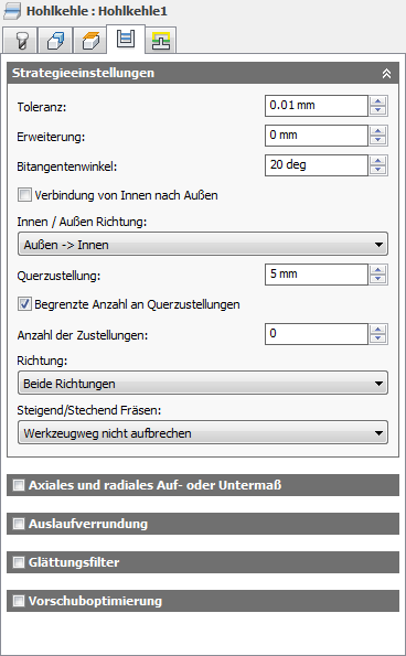 Unter der Bearbeitungstoleranz wird die Summe der Toleranzen verstanden, die für die Erstellung von Werkzeugwegen und Geometrietriangulation verwendet werden. Etwaige zusätzliche Filtertoleranzen müssen zu dieser Toleranz hinzugefügt werden, um die Gesamttoleranz zu erhalten.