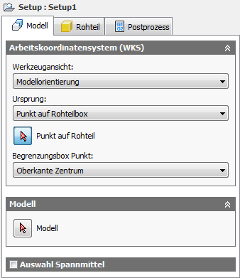 Im Normalfall wird eine Bearbeitungsoperation gestartet, indem Sie ein Setup erstellen. Ein Setup definiert eine Reihe von allgemeinen Eigenschaften für einen Satz von Bearbeitungsoperationen, darunter das Arbeitskoordinatensystem (WKS), die Rohteilgeometrie, Spannmittel und die Bearbeitungsflächen. Wenn Sie vor dem Hinzufügen Ihrer ersten Operation ein Setup nicht manuell erstellen, wird automatisch ein Setup mit Vorgabeparametern für Sie erstellt. Dies wurde im Lernprogramm 1 behandelt, wo Sie direkt eine 2D-Planen-Operation begonnen haben, ohne zunächst ein Setup zu erstellen.