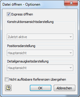Da bestimmte Befehle im Expressmodus nicht verfügbar sind, können Sie das Vorgabeverhalten für das Öffnen von Dateien abhängig von einem eindeutigen Dateischwellenwert festlegen. Dadurch können Sie sehr große Baugruppen im Expressmodus öffnen. Kleinere oder weniger komplexe Baugruppen hingegen werden vollständig geöffnet.