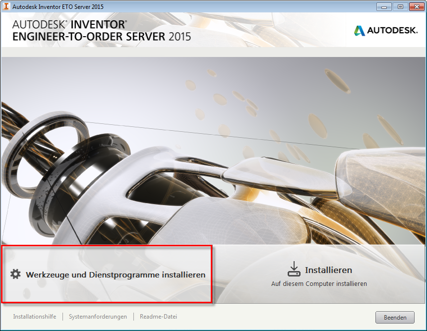 - Um den Network License Manager zu installieren, starten Sie Inventor ETO Server und wählen die Option Werkzeuge und Dienstprogramme installieren aus.