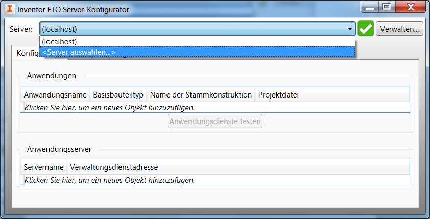 Inventor ETO Server-Konfigurator bietet die Möglichkeit zum Überwachen von Remote-Servern. Zusätzliche definierte Server werden in der Dropdown-Liste Server angezeigt. Um einen neuen Remote-Server zu definieren, klicken Sie in der Liste auf <Server auswählen...>.