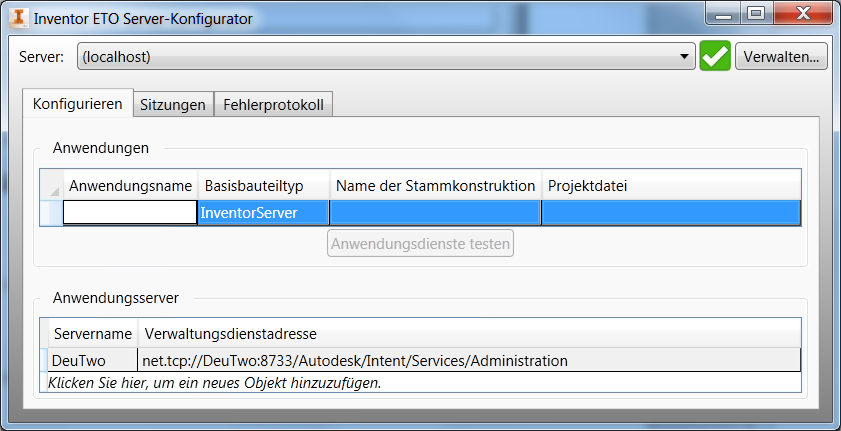 Um eine Anwendung hinzuzufügen, klicken Sie auf Klicken Sie hier, um ein neues Objekt hinzuzufügen. Anwendungen können nur lokal konfiguriert werden.