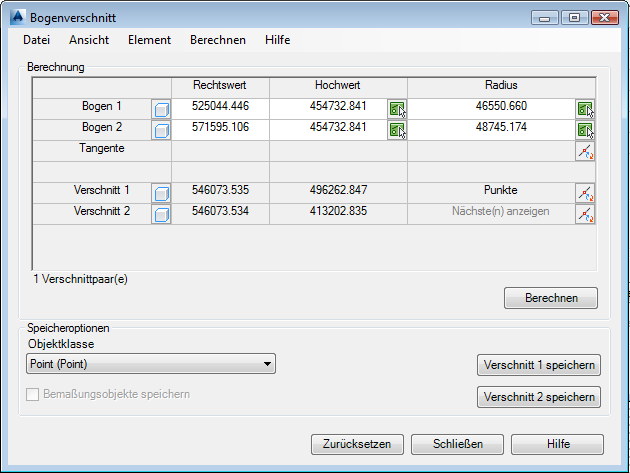 Im folgenden Dialogfeld Bogenverschnitt werden die Steuerelemente und Komponenten für die -Konstruktions- und Berechnungsbefehle angezeigt.