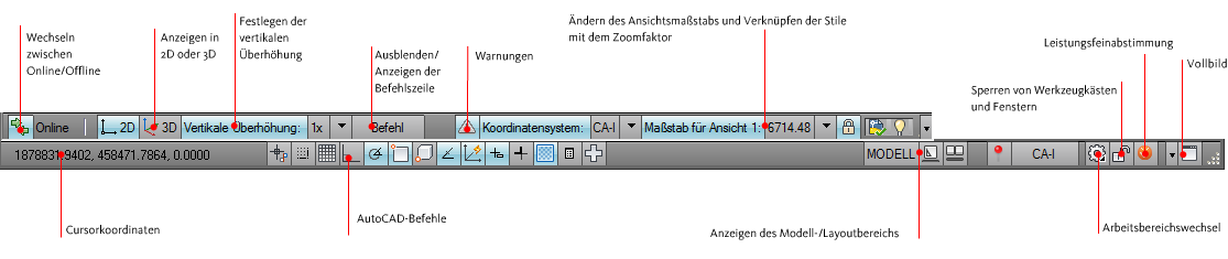 Die Hinweise zum aktuellen Befehl ersetzen einige Elemente auf der Statusleiste Einige Elemente werden nur während eines Vorgangs, wie Publizieren oder Plotten, angezeigt.