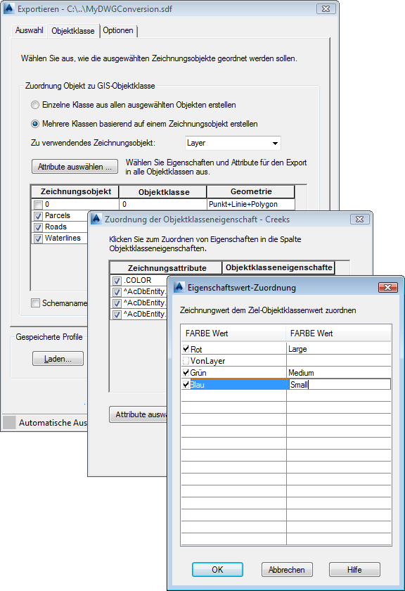 Über die Registerkarte Objektklasse können Sie AutoCAD-Zeichnungseigenschaften auch Eigenschaften in der SDF-Objektklasse zuordnen. Wenn Sie Farben für Linienstärke und Linientyp verwendet haben, um Objektmerkmale innerhalb eines Layers zu kennzeichnen, können Sie diese Eigenschaften den entsprechenden Merkmalen zuordnen. In dieser Zeichnung ordnen Sie der Wasserleitungsgröße eine Farbe zu. Sie können jede Wasserleitungsfarbe einer bestimmten Objekteigenschaft zuordnen.