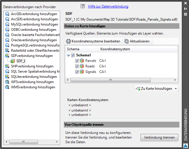 In dieser Übung stellen Sie eine Verbindung zu der neu erstellten SDF-Datei her und sehen die GIS-Objektklassen, die aus den drei Objektklassen erstellt wurden.