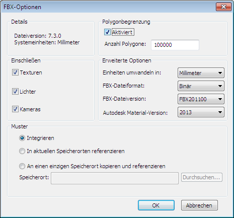 - Wählen Sie die gewünschten Erweiterten Optionen für die FBX-Datei.
