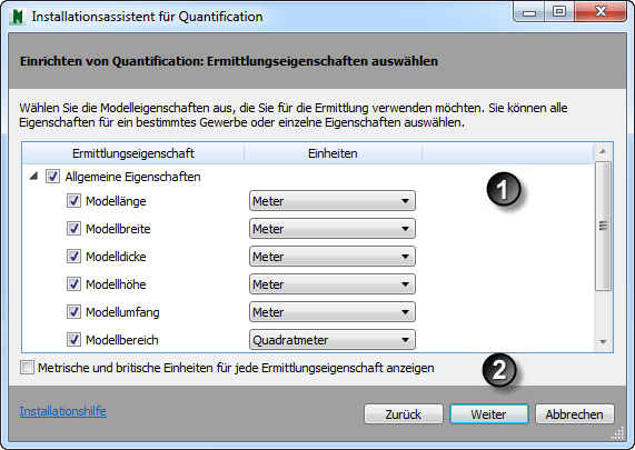 2. Metrische und britische Einheiten für jede Ermittlungseigenschaft anzeigen: Zeigt für jede Eigenschaft beide Maßeinheiten im Projekt an.