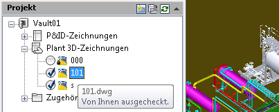 Projektdateien sind im Arbeitsbereichsordner zunächst schreibgeschützt. Der Projektmanager fordert Sie auf, die zu bearbeitenden Dateien auszuchecken. Wenn Ihre Änderungen abgeschlossen sind, können Sie Projektdateien einchecken. Sie können auch eine Synchronisierung mit dem Vault durchführen, um Ihre laufende Arbeit freizugeben, ohne die Dateien einzuchecken.