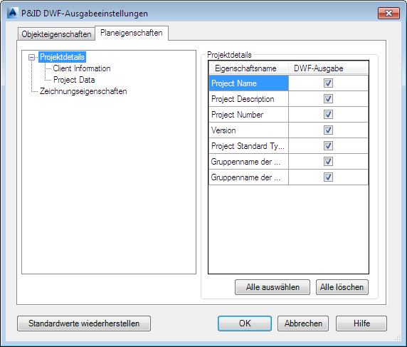 Vorgabemäßig werden alle Eigenschaften der Kategorien Projektdetails und Zeichnungseigenschaften aufgenommen.