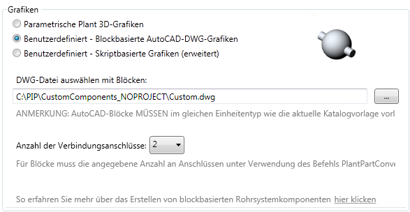 Sie können parametrische Formen oder blockbasierte Grafiken angeben. Weitere Informationen zu Geometrietypen finden Sie unter Ändern der Rohrleitungskomponenten in einem Katalog im Handbuch für Rohrklassen und Kataloge. Außerdem können Sie benutzerdefinierte parametrische (skriptbasierte) Geometrie angeben.