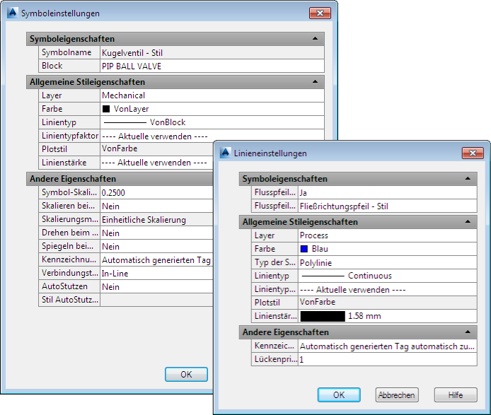Klassendefinitionen für Komponenten und Linien enthalten zwei Arten von Einstellungen und Eigenschaften: grafisch und nicht grafisch. Die grafischen Einstellungen und Eigenschaften steuern, wie die Komponente bzw. Linie in der P&ID-Zeichnung dargestellt wird.