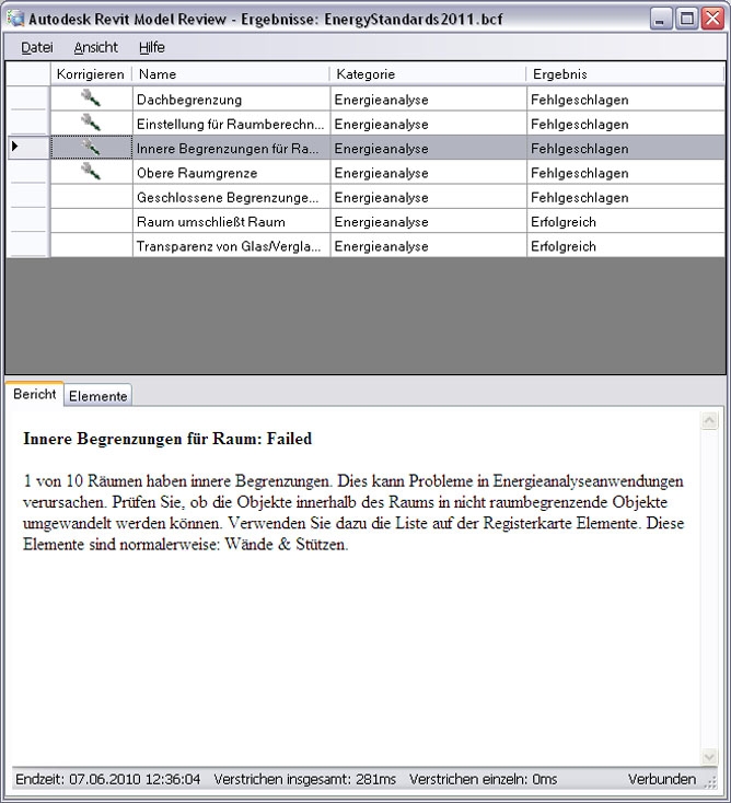 Nachdem Sie die Prüfung in Model Review ausgeführt haben, werden die Ergebnisse im Prüfungsergebnis-Browser angezeigt.