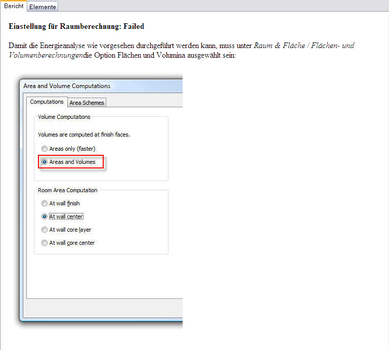 | Auswertungskriterien: | Prüft, ob die Optionen für die Volumenberechnung unter Einstellungen -> Flächen- und Volumenberechnungen -> Berechnungen richtig gewählt wurden und das Optionsfeld Flächen und Volumina aktiviert ist. |