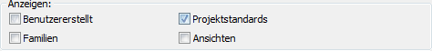 - Projektstandards: Enthält alle projektweiten Einstellungen, die für das Projekt definiert wurden (z. B. Linienstile und Füllmuster). Projektstandard-Bearbeitungsbereiche können weder umbenannt noch gelöscht werden.