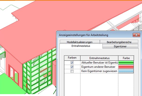 Wenn die Arbeitsteilung genutzt wird, können Sie den Auscheckstatus der Elemente durch die grafische Anzeige erkennbar machen. Weisen Sie den Elementen entsprechend ihren aktuellen Eigentümern Farben zu.