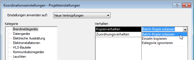 Geben Sie vor oder beim Kopieren von Installationen aus einem verknüpften Modell in ein MEP-Projekt ein Kopierverhalten für jede Installationskategorie im Dialogfeld Koordinationseinstellungen an (siehe Angeben von Koordinationseinstellungen).