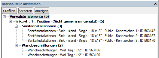 Suchen Sie verwaiste Elemente, deren Verknüpfungen zu den dazugehörigen Elementen des Grundmodells verloren gegangen sind, und stimmen Sie sie ab.