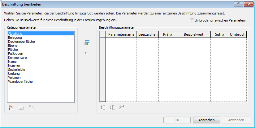 Das Fenster mit den Kategorieparametern enthält die zum Beschriftungstyp gehörigen Beschriftungsparameter. Unter Beschriftungsparameter werden die Kategorieparameter aufgelistet, die in der Beschriftung angezeigt werden sollen. Normalerweise ist dies ein einziger Parameter, Sie können jedoch komplexere Beschriftungen erstellen, in denen mehrere Angaben aufeinander folgen.