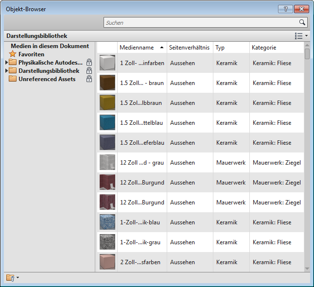 Objekte werden in einem Revit-Projekt oder in einer Bibliothek gespeichert. Objekte, die in einem Revit-Projekt enthalten sind, aber von keinem Material referenziert werden, werden in der Bibliothek Nicht referenzierte Objekte gespeichert. Sie können nicht referenzierte Objekte während einer Revit-Sitzung nach Bedarf erstellen und bearbeiten. Sie müssen jedoch Ihr Revit-Projekt speichern, damit die nicht referenzierten Objekte, die Sie während der Sitzung erstellt oder bearbeitet haben, gespeichert werden.