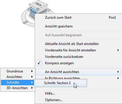 Mit dem ViewCube können Sie eine 3D-Ansicht an beliebigen Draufsichten, Schnitt- und Ansichtsdarstellungen oder 3D-Ansichten im Projekt ausrichten.